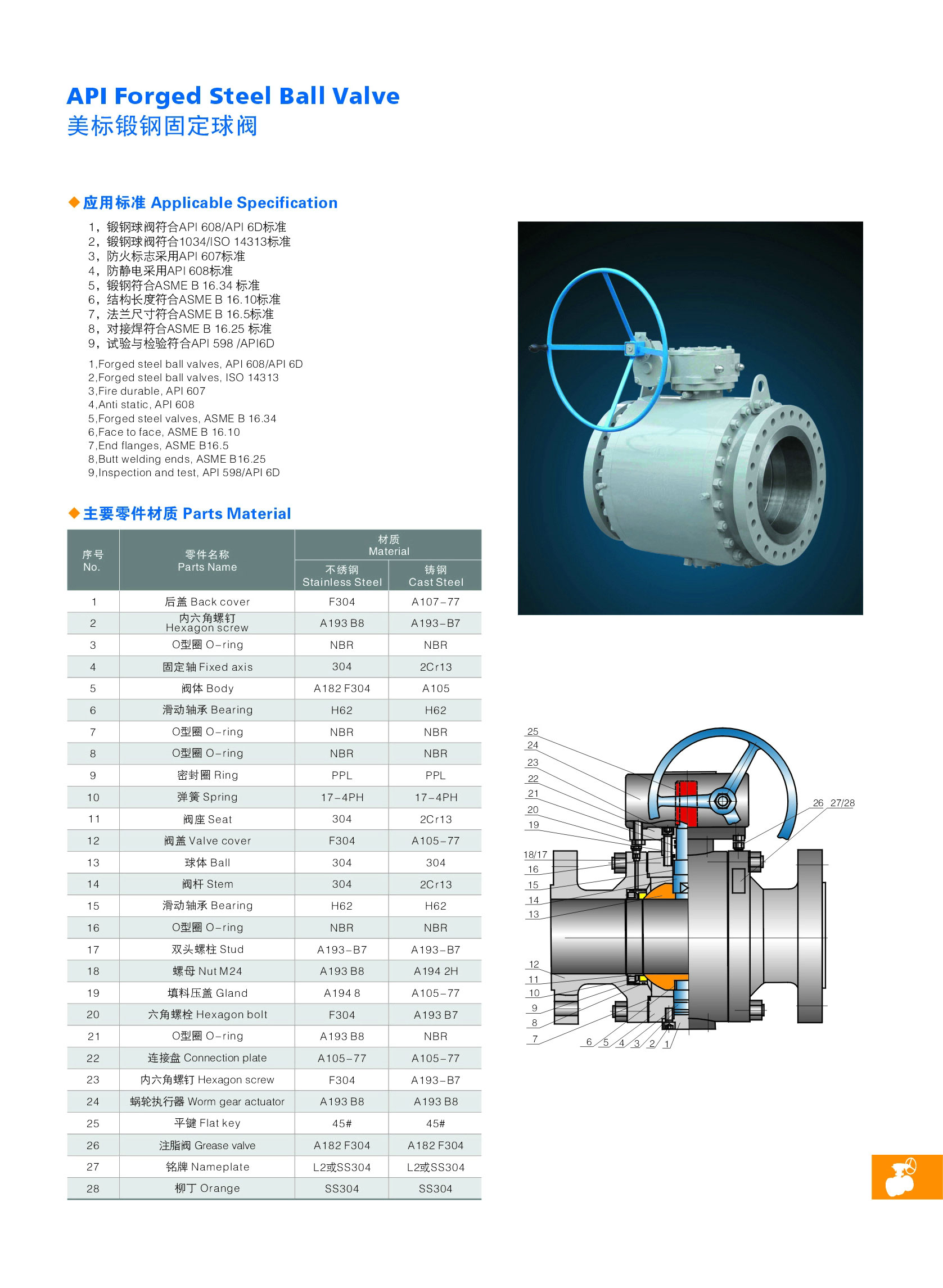 采用双重密封,当发生火灾时,非金属阀座烧损后,介质将球体压紧在阀体上的金属密封面阻止介质大量漏出,符合API607规定。