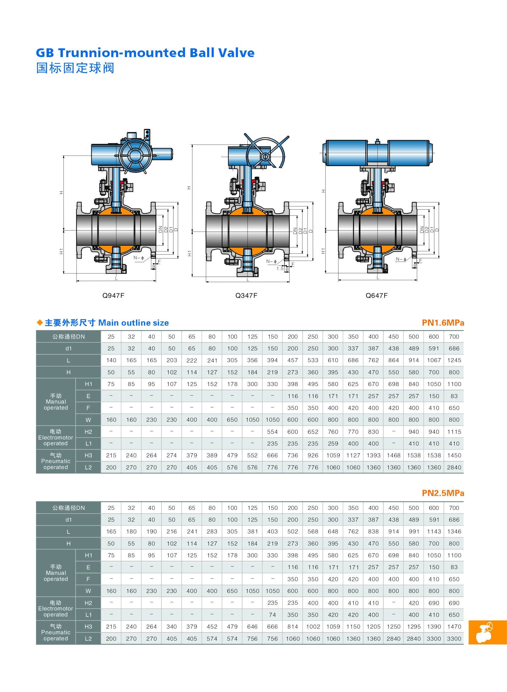 Q347Y-16/25C大口径金属硬密封固定式球阀是新一代高性能球阀,适用于长输管线和一般工业管线,其强度、安全性、耐恶劣环境性等在设计时进行了特殊考虑,适用于各种腐蚀性和非腐蚀性介质。它与浮动球阀相比,工作时,阀前流体压力在球体上产生的作用力全部传递给轴承,不会使球体向阀座移动,因而阀座变形小,密封性能稳定、使用寿命长,适用于高压、大口径场合。先进的弹簧预阀座组件,具有自紧特性,实现上游密封。每阀有两个阀座,每个方向都能密封因而安装没有流向限制,是双向。本阀有二块式和三块式两种阀体结构,中法兰用螺栓连接,密封采用增强聚四氟乙烯镶入不锈钢圈内,钢圈后部设有弹簧保证阀座紧贴球体,保持密封。上下阀杆均设有PTFE轴承,减少磨擦,操作省力,小轴底部没有调整片,保证球与密封圈的接处位置。采用全通径的结构使阀门流量孔么与管线内径一致,以便管线清扫。