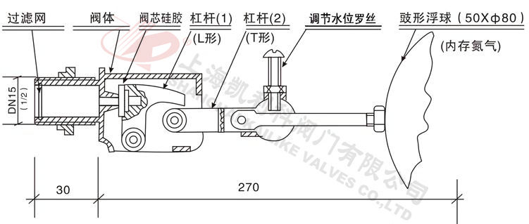 上海凯利科为使消费者在无需更改管道配置的情况下可方便控制水池液位高度,本产品特别改进浮球连杆形式,加入液位调节齿轮杆组,使水池液面在调节杆长度范围内可任意调整,以满足不同情况的需要。