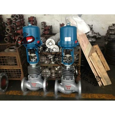 2、ZDLM蒸汽流量调节阀是由PSL系列和3810L系列智能型电子式电动执行器通过支架与单座、套筒调节阀连接在一起所 组成。当输入端无信号时,执行器稳定在预选的零位,调节阀处于全开或全闭的位置,执行器的输出轴通过开合螺 母与调节阀的阀杆相连。当输入端有信号时输出轴即通过输入信号按一定比例处在一定的位置,调节阀即处于所需开度,从而达到了调节和控制的目的。蒸汽流量调节阀分为电开式和电闭式两种。通过选择电子式电动执行器的正、反 作用开关来实现电开式和电闭式调节。