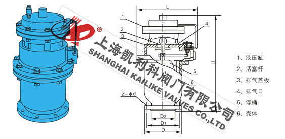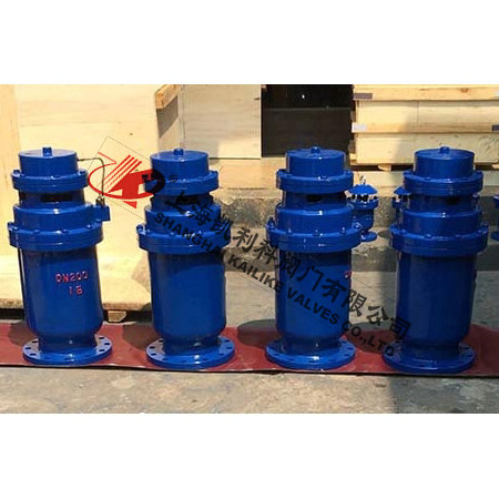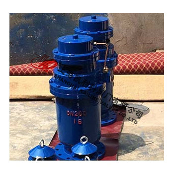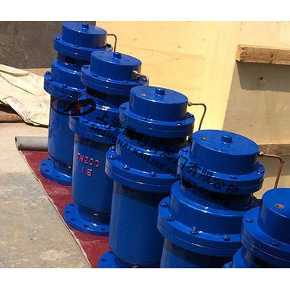 QSP全压高速排气阀由下阀体,中阀体,浮筒,浮筒杆,阀芯,盖板,活塞杆,膜片及阀盖等组成的全压高速排气阀,其特征是通过销轴与浮筒铰接的浮筒杆可绕主轴转动,并由此实现通过浮筒升降控制阀芯的升降启闭,即当浮筒下降(阀体里充满气体)时,阀芯上升,打开小阀口,并关闭小排气帽上的排气口,使气体通过导管进入液压罐内,当浮筒在浮力作用下上升时候,阀芯下降,关闭小阀口,同时打开排气帽上的排气口,使液压罐通过导管,直通大气泄压,且当浮筒下降,液压缸内充满气体时,阀门上的大排气口自动关闭。当水泵停止,管内水流空时或遇到管内产生负压时,吸入空气,确保管线安全。