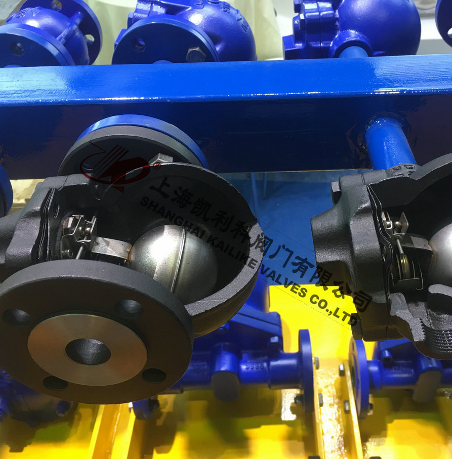 该阀刚启动时,自动排空气装置迅速排除系统中不凝结气体,当蒸汽和热凝结水进入后,阀腔内温度随着升高,排空气装置自动关闭,浮球根据凝结水水位的变化而作升降,带动杠杆调节阀座孔的开度,连续排放凝结水。当凝结水停止进入时,浮球靠自重下降,驱使杠杆带动阀芯关闭排水阀座孔。