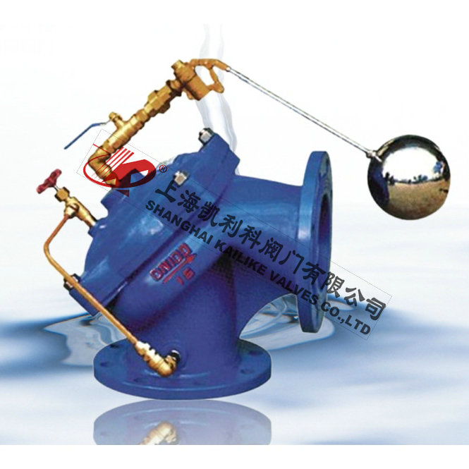 100A角型定水位阀是一种隔膜式调节水箱和水塔液面高度的阀门。阀门由一特殊强化尼龙膜片将其分为上下两个腔室,当液面达到设定位置时,浮球导阀关闭,上腔压力大于下腔,阀门关闭,即停止供水.当液面下降超过预设位置,浮球导阀开启,上腔压力小于下腔压力,阀门开启.阀门向池内供水。