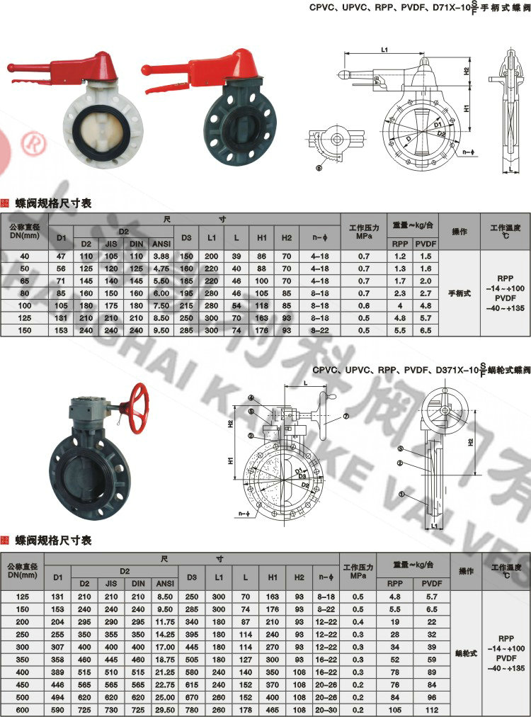 PVDF塑料蝶阀适用于带腐蚀性介质的输送过程的截流,根据不同材质温度-14℃~100℃、-40℃~140℃。密封圈采用F4。耐腐性能优异,延长使用寿命。转动灵活、使用方便。整体式球阀泄漏点少,强度高,装拆方便。含硬颗粒液体容易使球表面划伤。全部零件采用FRPP、PVDF、CPVC、UPVC、PVC、