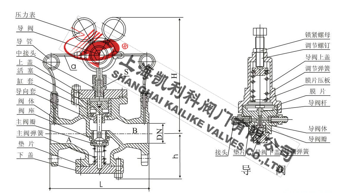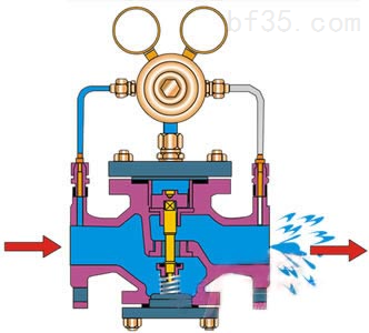 YK43F、YK43X煤气减压阀本系列减压阀属于先导活塞式减压阀。由主阀和导阀两部分组成。主阀主要由阀座、主阀盘、活塞、弹簧等零件组成。导阀主要由阀座、阀瓣、膜片、弹簧、调节弹簧等零件组成。通过调节调节弹簧压力设定出口压力、利用膜片传感出口压力变化,通过导阀启闭驱动活塞调节主阀节流部位过流面积的大小,实现减压稳压功能。