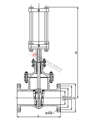 1、本阀主要由阀体、阀盖、闸板、阀杆、密封圈、双层气缸及其活塞、活塞杆、隔板连同缓冲机构、手动机构、气动-手动转换装置和阀盖填料装置等部分组成。